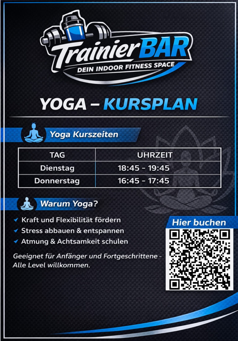 Das benötigte Equipment ist alles vor Ort. Gerne Gute Laune, Motivation und ein Handtuch mitbringen. Sogar gekühlte Getränke gibt es vor Ort. Lockere Sportklamotten und saubere Turnschuhe sind obligatorisch. Wenn Du eine eigene Trainingsmatte hast, kannst Du diese natürlich auch mitnehmen (vor allem bei den Yoga Stunden).